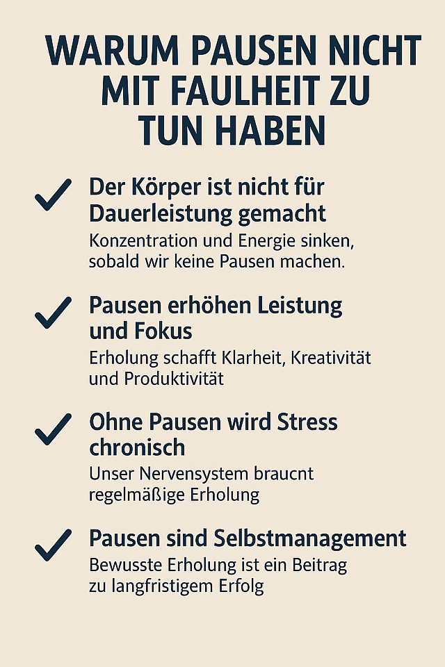 Wer bewusst Pausen einplant, arbeitet klarer, strukturierter und leistungsfähiger.